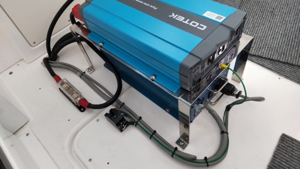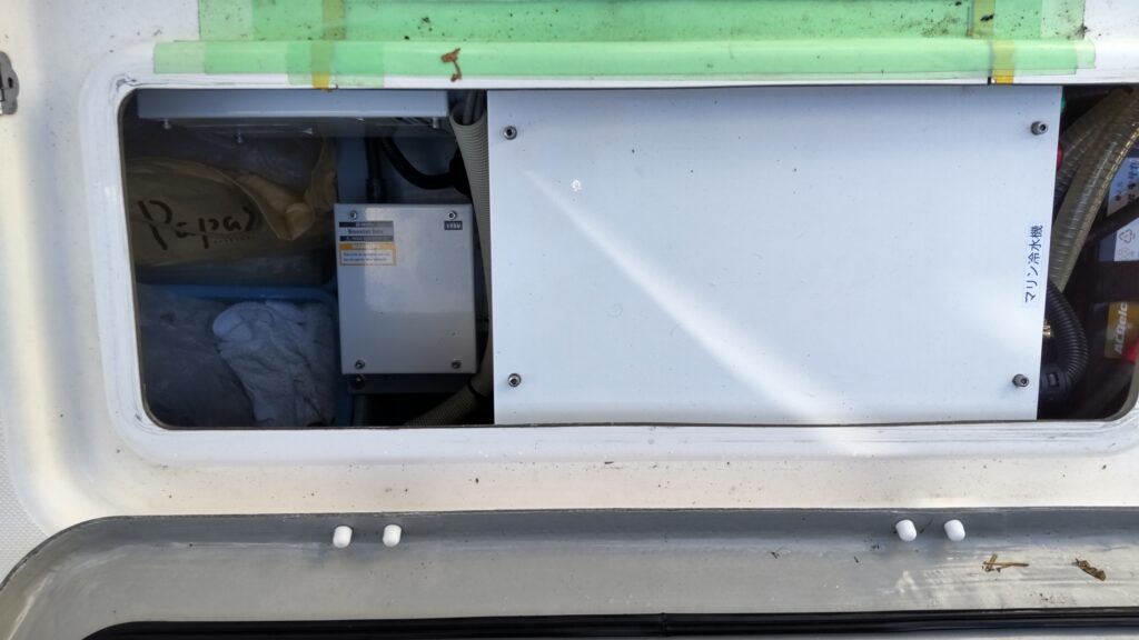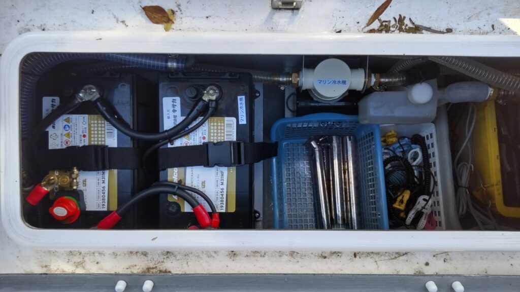 インバーターは純正のインバーターの上に、5cm高の馬を製作して設置、本体は左前のストレージ、バッテリーは左後ろのストレージ、海水と生簀のフィルターは左後方のストレージ